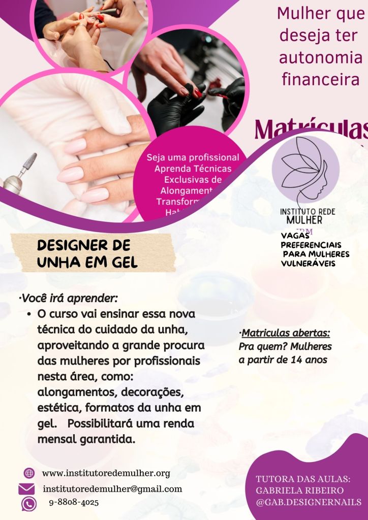 O curso visa ensinar essa nova técnica, cuidando da estética, formatos, alongamentos e decorações das unhas femininas, aproveitando a grande procura das mulheres por profissionais nesta área. Esse conhecimento possibilitará uma renda mensal garantida.