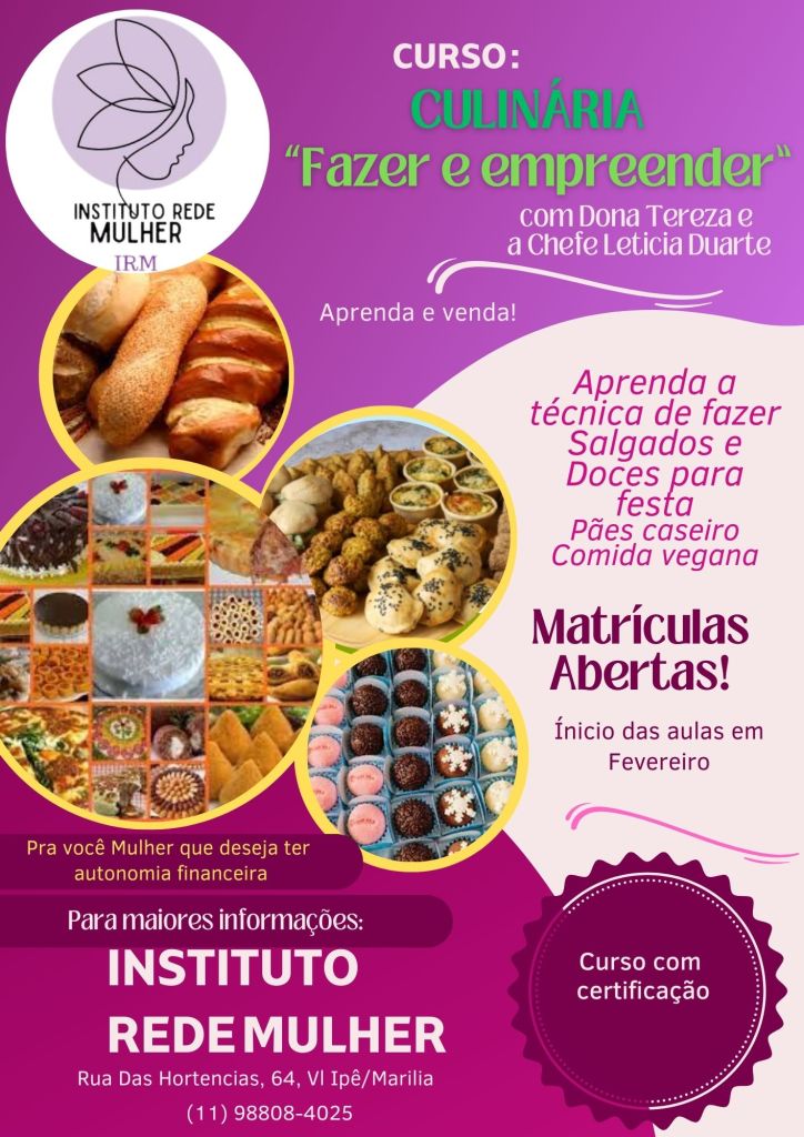 É uma das opções de geração de renda para quem está fora do mercado formal de trabalho ou para quem precisa conseguir um dinheirinho a mais para reforçar o orçamento da família. O curso traz a Técnica de fazer Pães, Doces e Salgados, para a geração de renda.